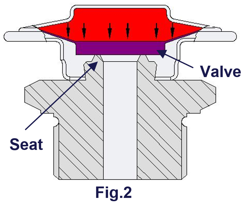 低溫冷凝水的排除後,隨之而來的高溫冷凝水使液囊式感溫元件溫度上升,液囊中混合液因溫度上升開始氣化,體積膨脹,致使液囊內壓力增加。液囊中的壓力增加,感溫元件牽動閥頭移動到關閉位置。在冷凝水達到飽和溫度之前,閥門完全關閉(fig.2)
